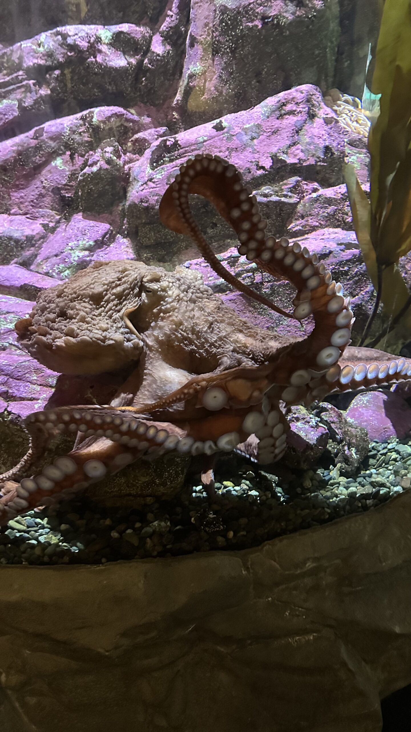 Po lewej: strefa pływów i dotykowe baseny — miejsce, gdzie można z bliska zobaczyć (i poczuć) życie przybrzeżne Pacyfiku. W środku: ogromna ośmiornica pacyficzna — jedna z najbardziej fascynujących mieszkanek akwarium i dowód na to, jak inteligentne potrafią być głowonogi. Po prawej: morskie gwiazdy i płytkie zbiorniki inspirowane skalistym wybrzeżem — spokojny, kolorowy fragment wystawy.