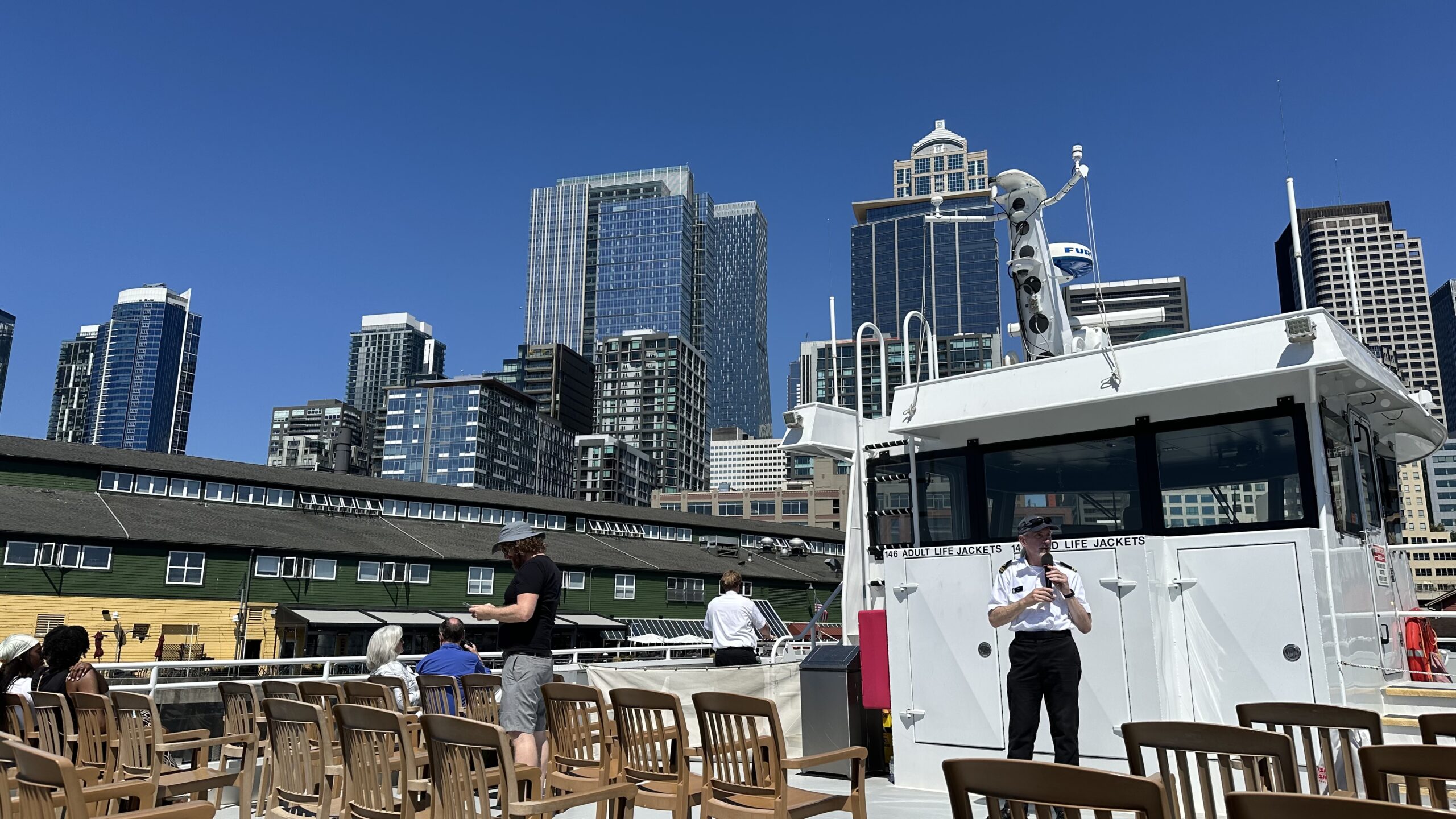 W praktyce wygląda to tak: wsiadasz na statek przy Pier 55 na Seattle Waterfront i ruszasz w pętlę po zatoce. Po drodze jest komentarz na żywo od przewodnika: o porcie, historii nabrzeża, promach, dzielnicach i o tym, dlaczego Seattle wyrosło właśnie tutaj — nad wodą.