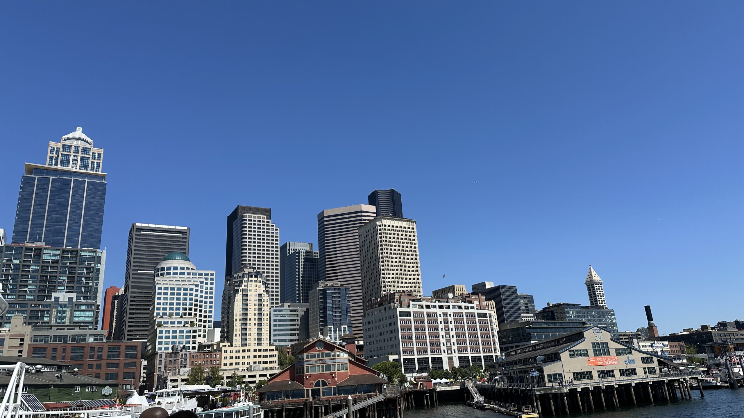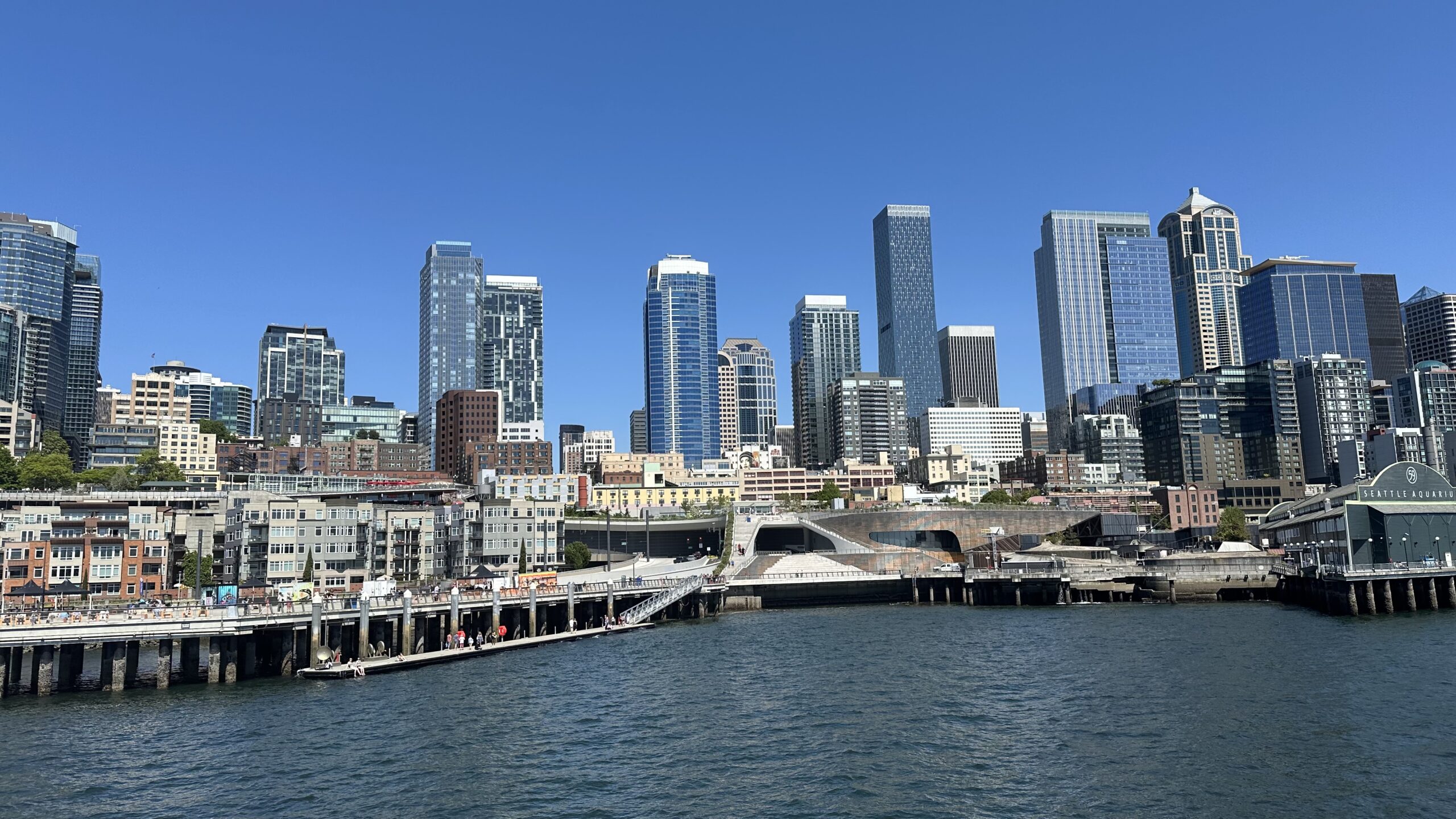 Z pokładu Seattle Harbor Cruise najlepiej widać, jak nabrzeże łączy się z centrum: molo, promenadę i gęstą zabudowę Downtown w jednym kadrze. Po prawej stronie mija się m.in. okolice Seattle Aquarium, a w tle rośnie panorama miasta z wieżowcami. Ta perspektywa z Elliott Bay robi największe wrażenie — Seattle wygląda bardziej przestrzennie i spokojniej niż z lądu.