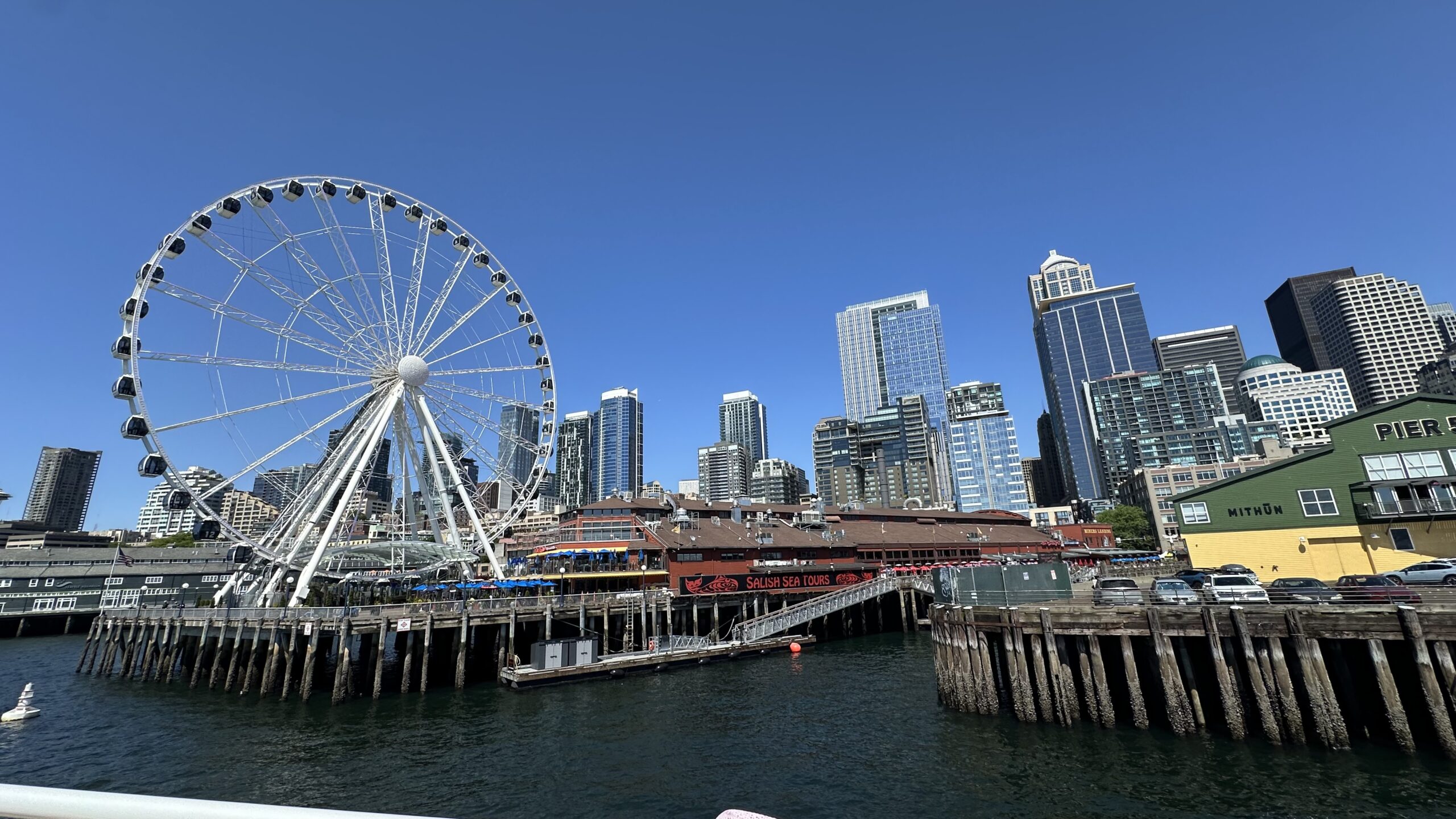 Pierwsze minuty rejsu po Elliott Bay. Seattle Waterfront widziane od strony wody – Great Wheel to jeden z najbardziej charakterystycznych punktów trasy Seattle Harbor Cruise (Argosy).