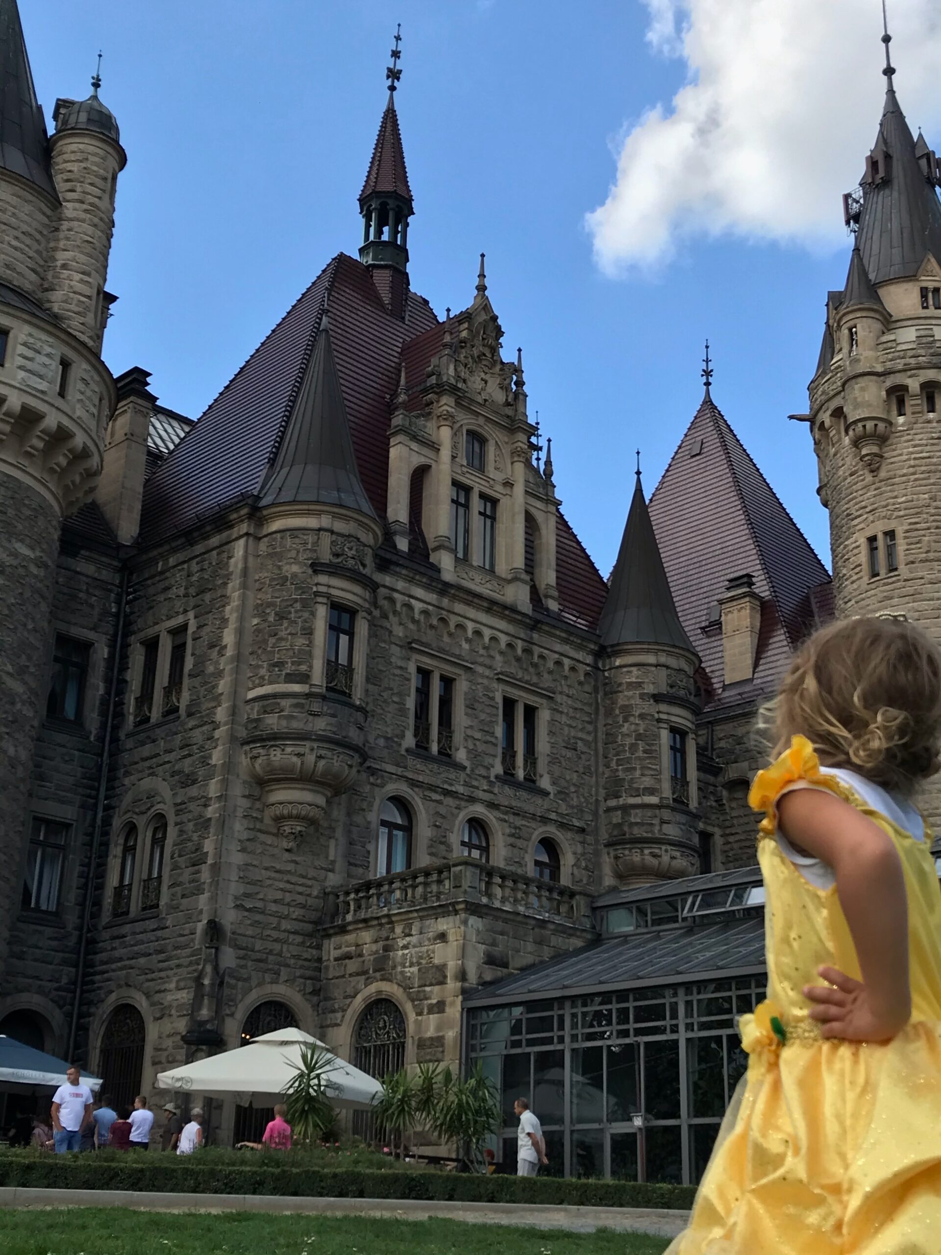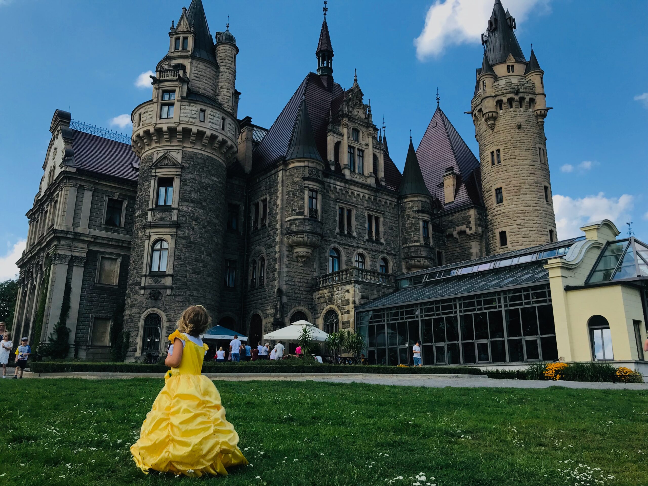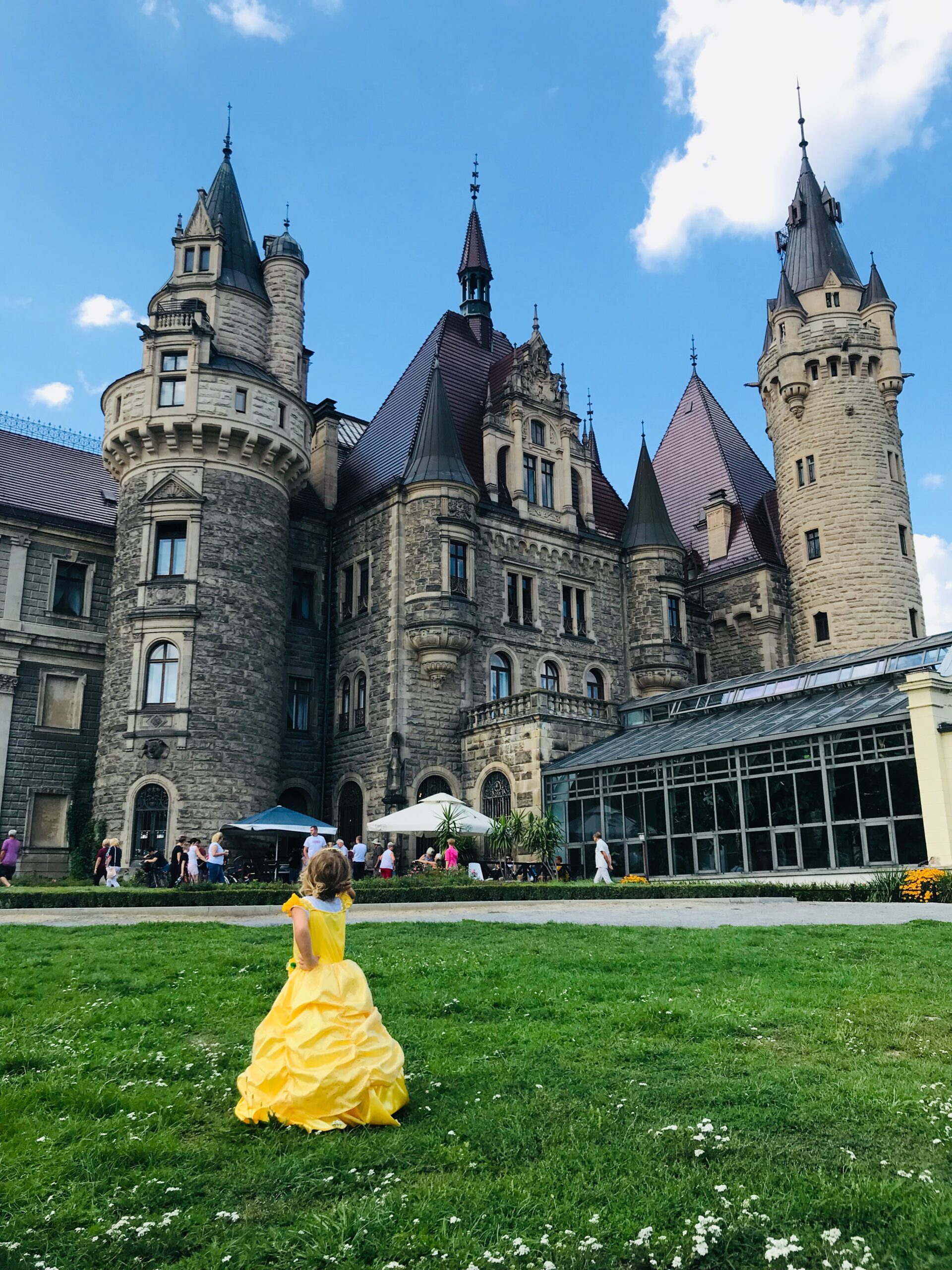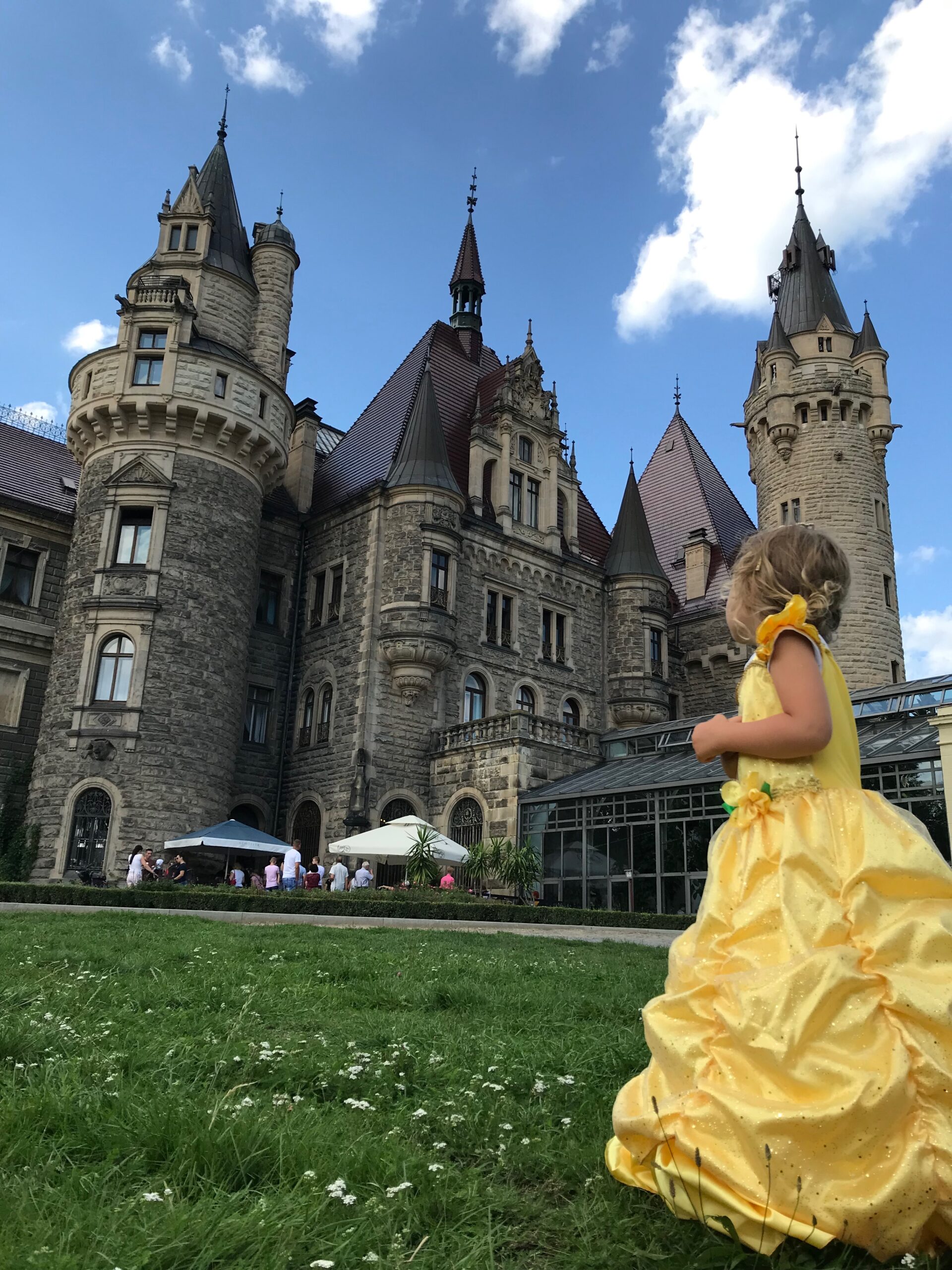 Jak już wspomnieliśmy, pomysł wyjazdu do Zamku w Mosznej pojawił się jako prezent na czwarte urodziny Klary, ale szybko okazało się, że to my — dorośli — równie mocno czekamy na tę wizytę. Skala, architektura i atmosfera zamku przyciągają uwagę na tyle mocno, że odkrywanie go ma w sobie coś z baśni. Suknia Belli, którą Klara dostała tego dnia, dodała całej wyprawie lekko symbolicznego tonu.