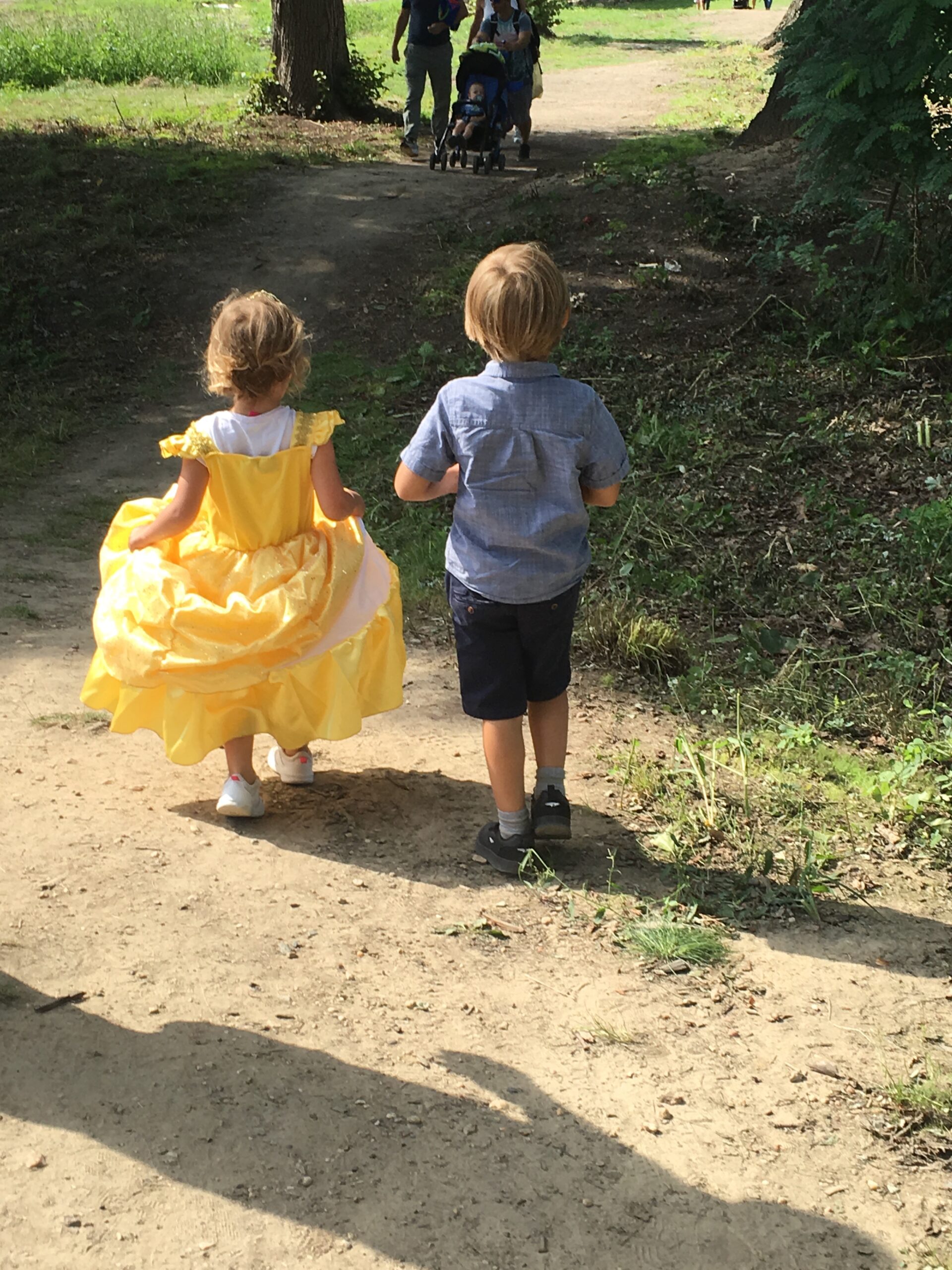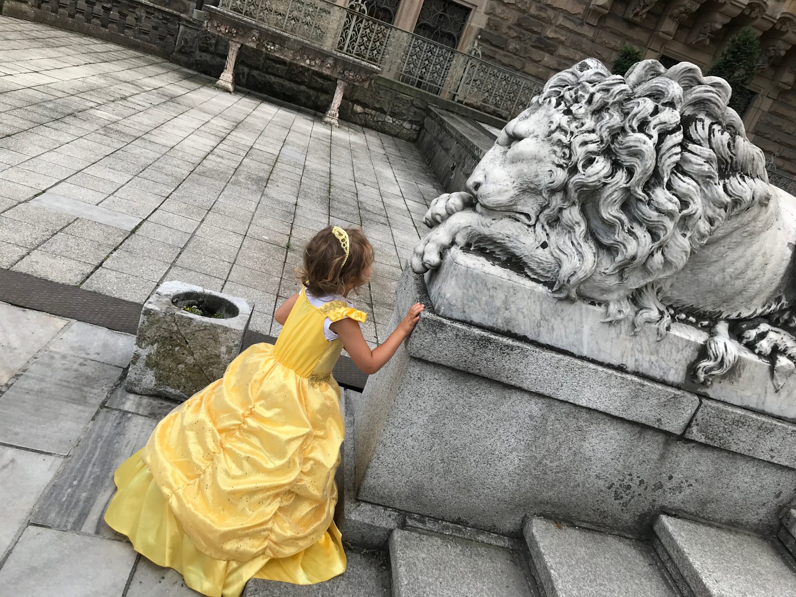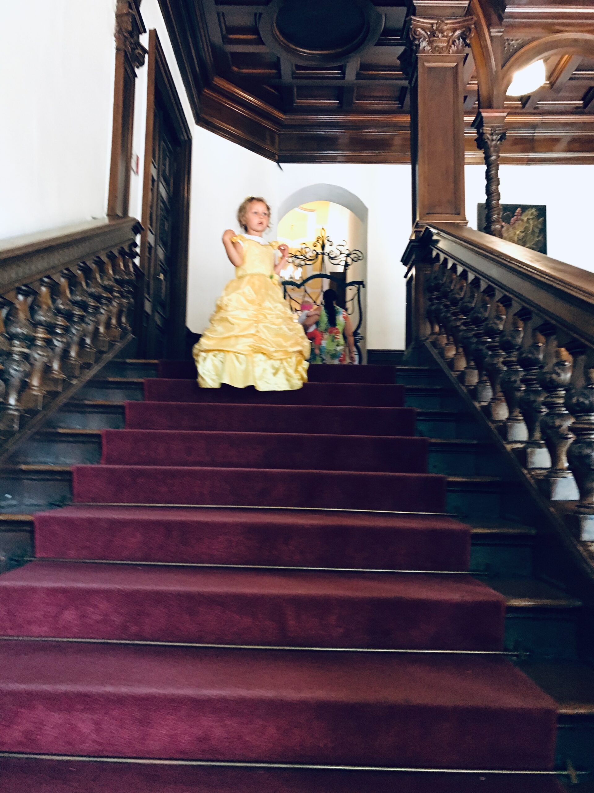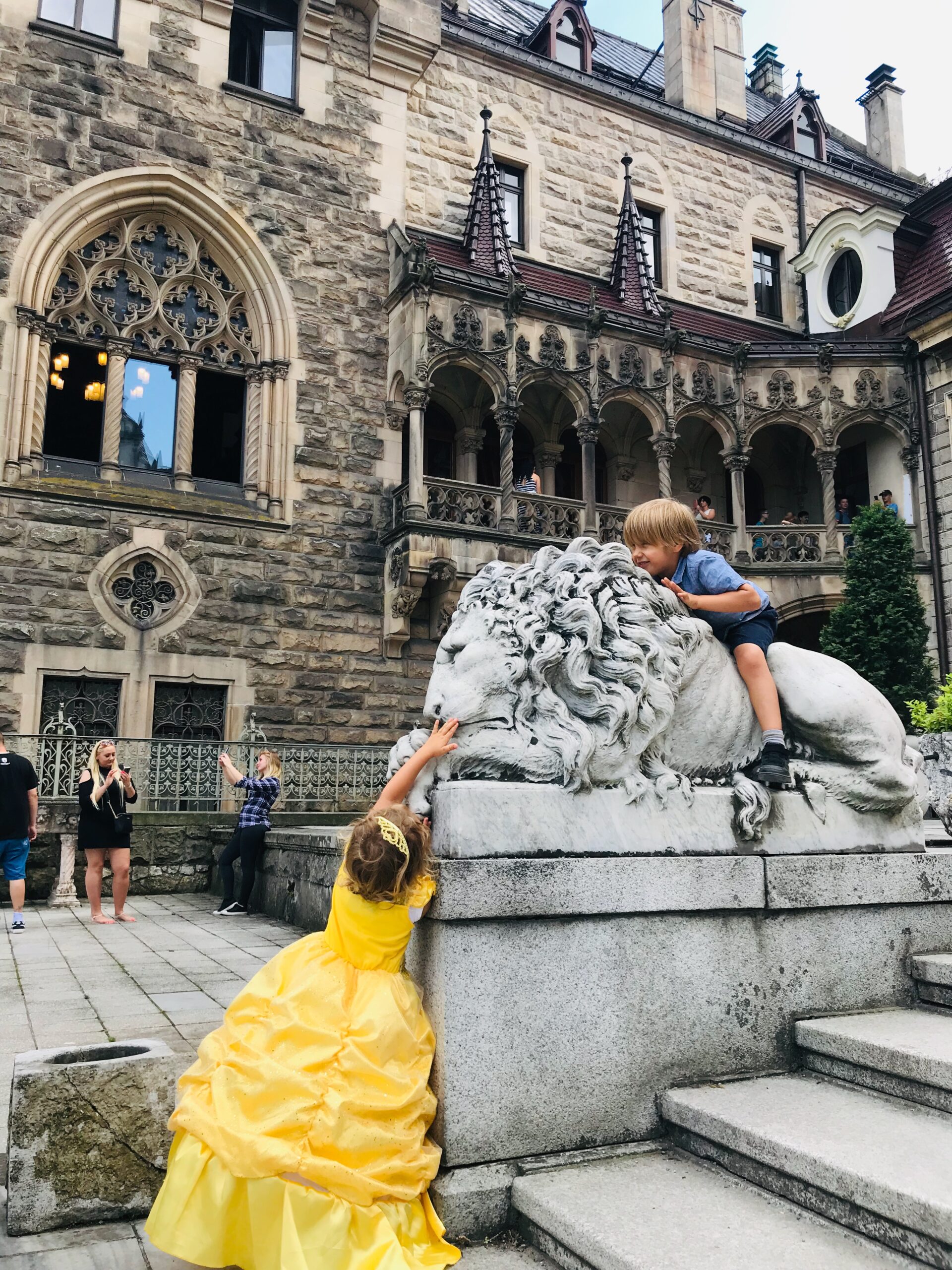 Jak już wspomnieliśmy, pomysł wyjazdu do Zamku w Mosznej pojawił się jako prezent na czwarte urodziny Klary, ale szybko okazało się, że to my — dorośli — równie mocno czekamy na tę wizytę. Skala, architektura i atmosfera zamku przyciągają uwagę na tyle mocno, że odkrywanie go ma w sobie coś z baśni. Suknia Belli, którą Klara dostała tego dnia, dodała całej wyprawie lekko symbolicznego tonu.