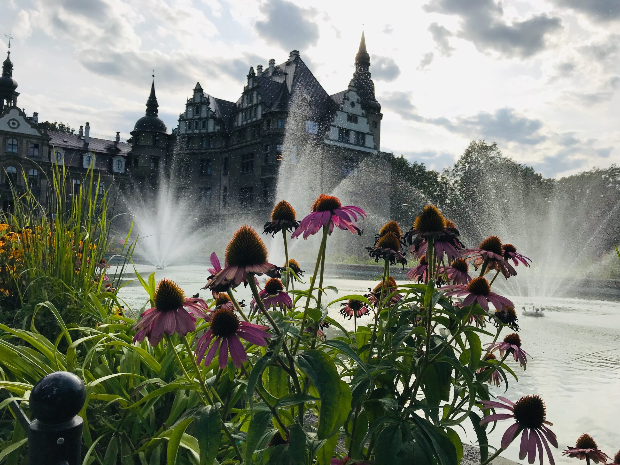 Budowla pojawiała się przed nami niespodziewanie — kierując się parkową drogą w stronę obranego celu, nagle zauważyliśmy, że między drzewami wyrasta fasada z dziesiątkami wież, okien i detali, których nie sposób ogarnąć jednym spojrzeniem. Architektura jest tu eklektyczna, momentami wręcz teatralna, co nadaje temu miejscu charakteru bardziej emocjonalnego niż muzealnego. Człowiek zatrzymuje się naturalnie, żeby po prostu popatrzeć. Zamek nie tyle zachwyca, co wciąga — skłania, by podejść bliżej, przejść przez dziedziniec, spojrzeć w górę i spróbować znaleźć porządek w tej architektonicznej różnorodności.