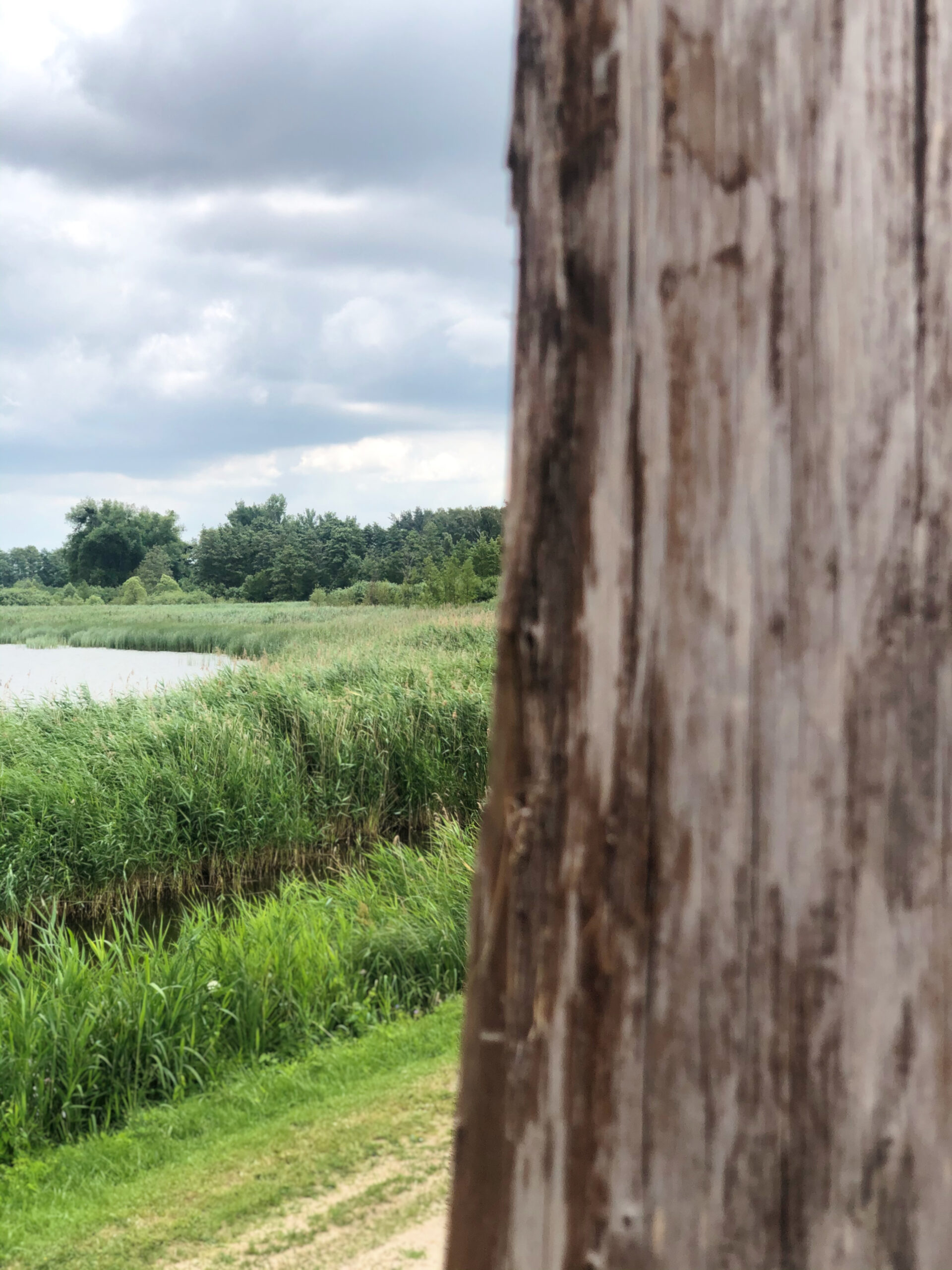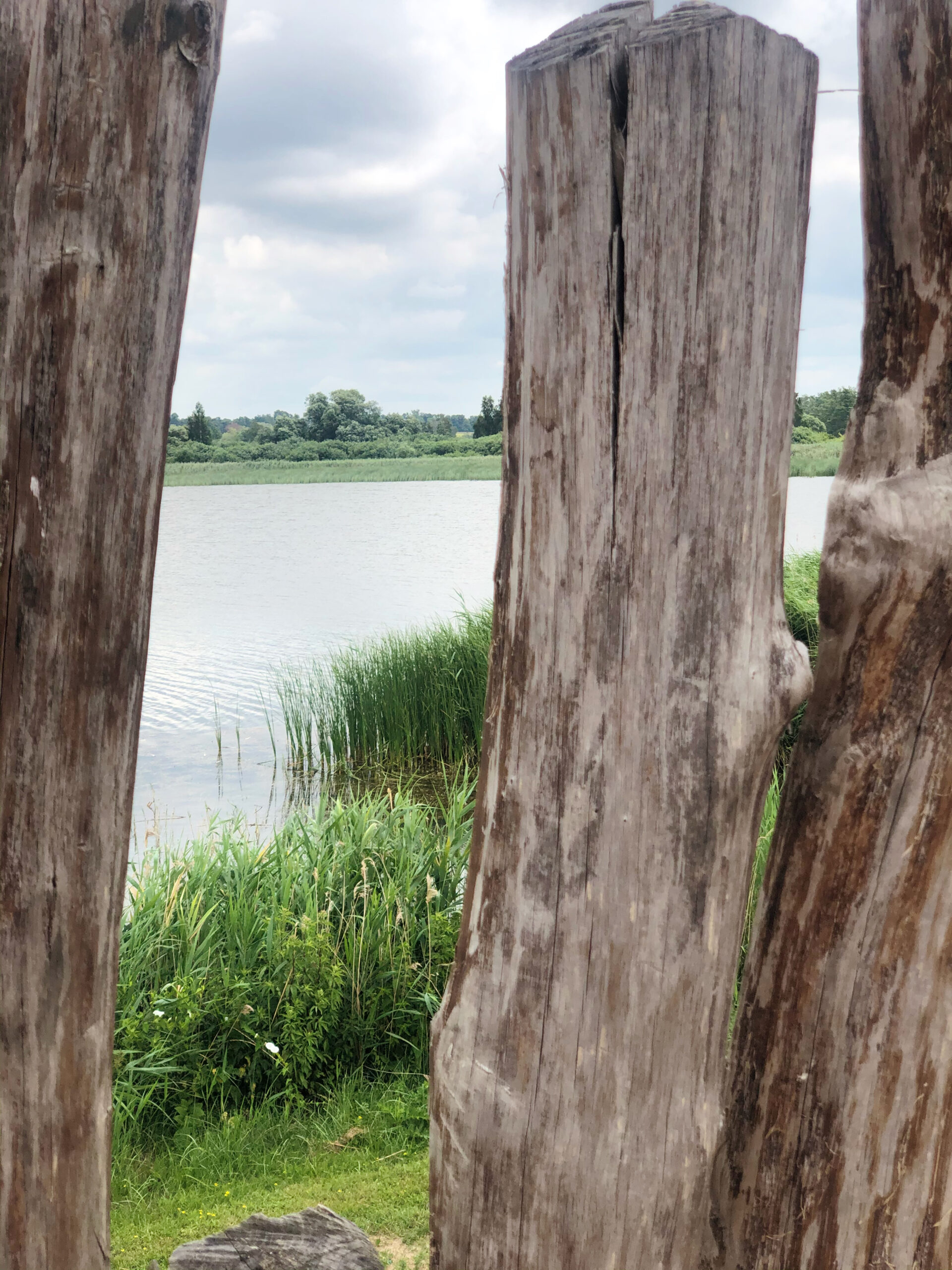 Wystarczy odejść kilkanaście kroków od osady, by znaleźć się w miejscu, które działa zupełnie inaczej niż rekonstrukcje i warsztaty — przy Jeziorze Biskupińskim. Drewniana kładka prowadzi wzdłuż trzcin, a woda, zależnie od światła, przyjmuje odcienie od głębokiej zieleni po ciemny granat.Panuje tu naturalna cisza, słychać tylko ptaki, trzcinę poruszaną wiatrem i ciche pluski wody.