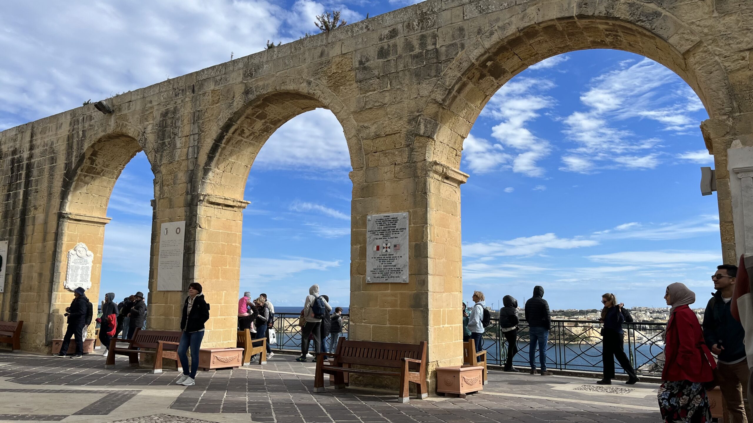 Zwiedzanie Valetty rozpoczęliśmy od Upper Barrakka Gardens, które powstały w XVI wieku jako prywatne miejsce odpoczynku dla rycerzy Zakonu Maltańskiego. To właśnie tutaj przychodzili po służbie by złapać oddech, popatrzeć na morze i porozmawiać w cieniu kolumnad. Dopiero później ogrody otwarto dla mieszkańców i podróżników — i do dziś są jednym z najbardziej lubianych punktów na mapie Valletty.