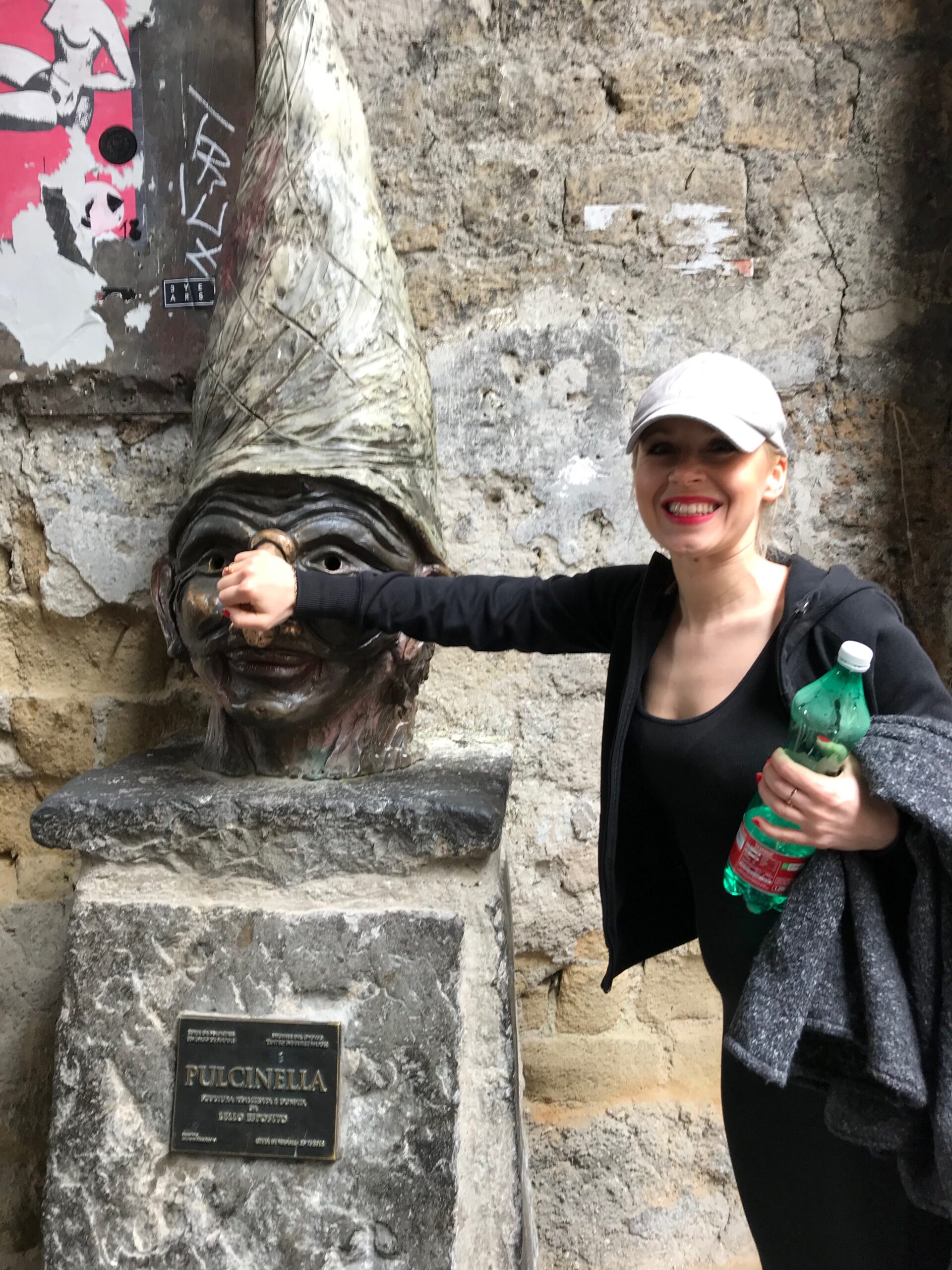 Pulcinella pojawia się w Neapolu wszędzie — na figurkach, muralach, pamiątkach. To postać z commedii dell’arte, ale w Neapolu ma głębsze znaczenie. Jest jednocześnie zabawny i tragiczny, sprytny i zmęczony życiem.