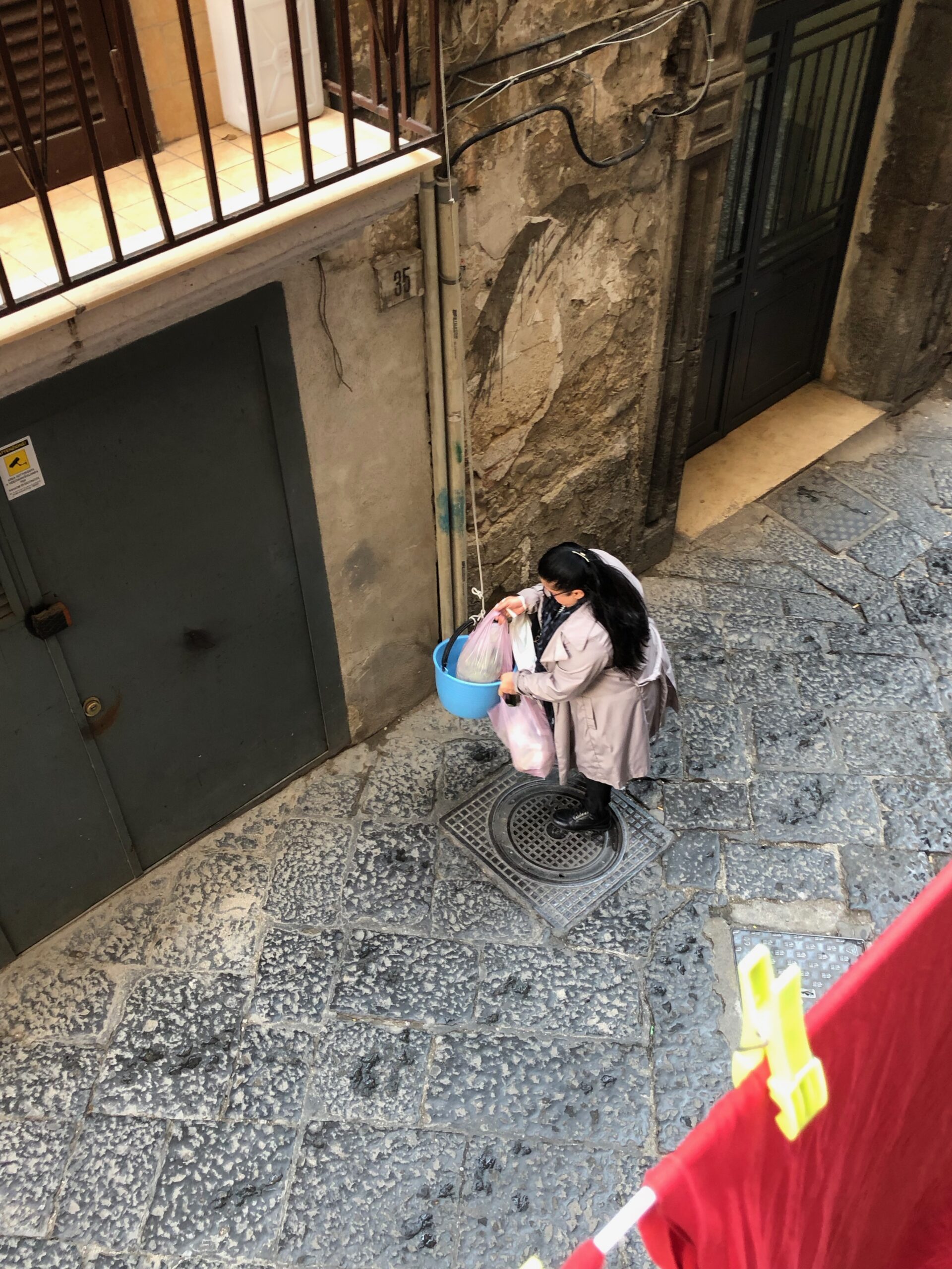 Pranie wiszące wysoko między kamienicami nie jest tu dekoracją ani romantycznym symbolem południa. To konieczność. Kamienice są stare, wysokie, bez wind. Zakupów nie wnosi się po schodach — wkłada się je do wiader, które ktoś z góry wciąga na sznurku. Ten system działa tu od lat i nikogo nie dziwi. Tak samo jak skutery przeciskające się między pieszymi, rozmowy prowadzone z okna do okna i dzieci bawiące się tuż obok wejść do domów.