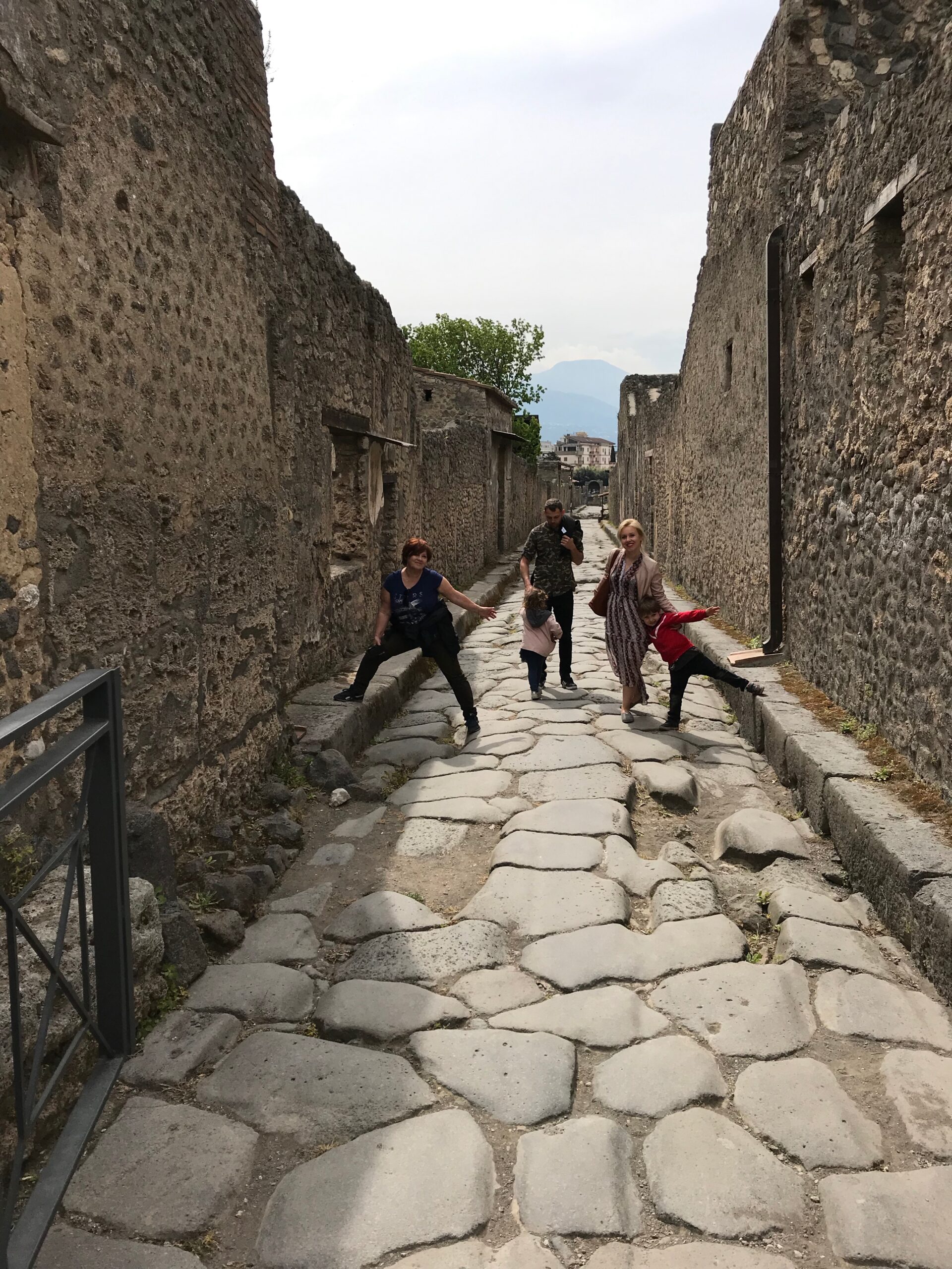 Zwiedzanie Pompejów nie przypomina wizyty w muzeum ani klasycznego zwiedzania zabytków. To raczej długi spacer po prawdziwym mieście, w którym czas nagle się zatrzymał. Już po przekroczeniu bramy wchodzi się na kamienne ulice z wyraźnymi koleinami po rzymskich wozach, a dzieci bardzo szybko zauważają, że to nie są „ruiny do oglądania z daleka”, tylko przestrzeń, po której naprawdę się chodzi.