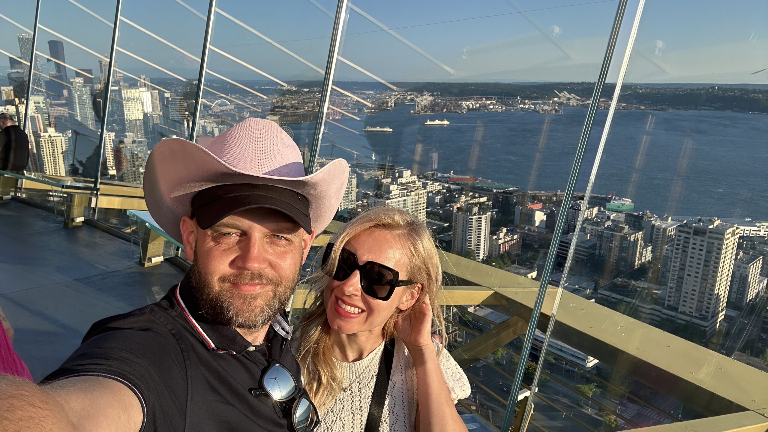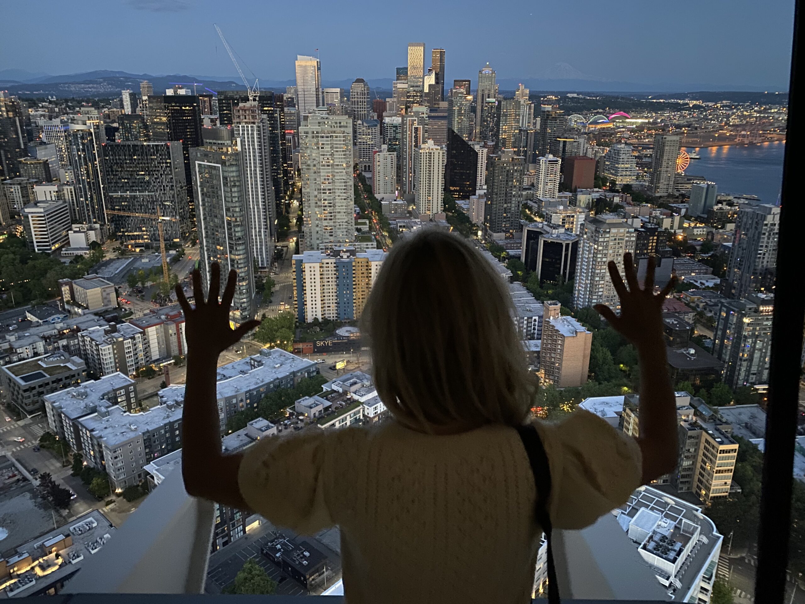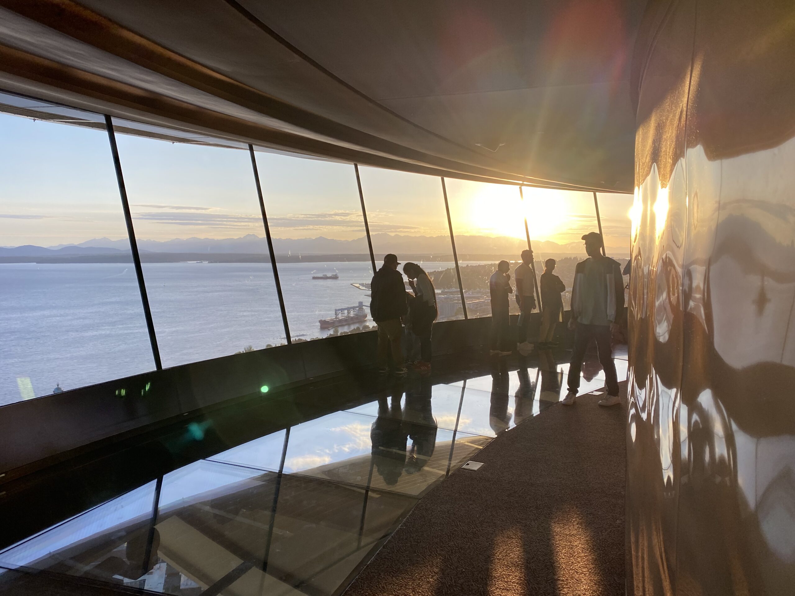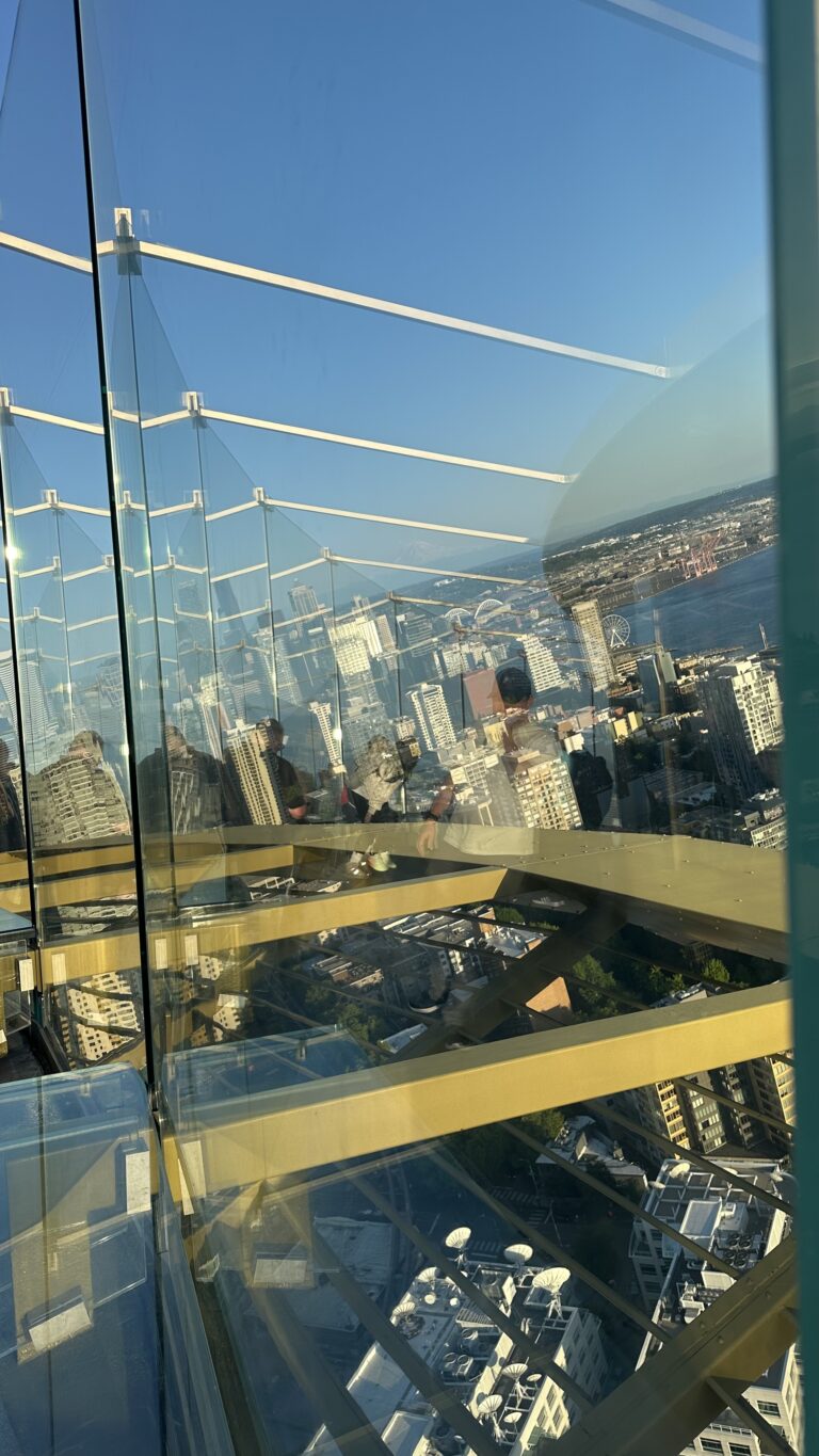 Na szczycie czeka otwarty taras widokowy. Taki, na którym czujesz wiatr, a barierki są ze szkła, więc nic nie zabiera widoku. Tu dopiero widać, jak bardzo Seattle jest „miastem pomiędzy” — między wodą a górami, między nowoczesnością a naturą.