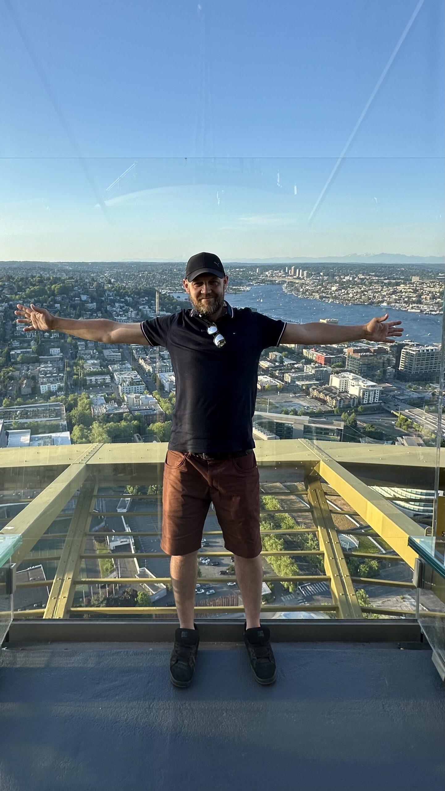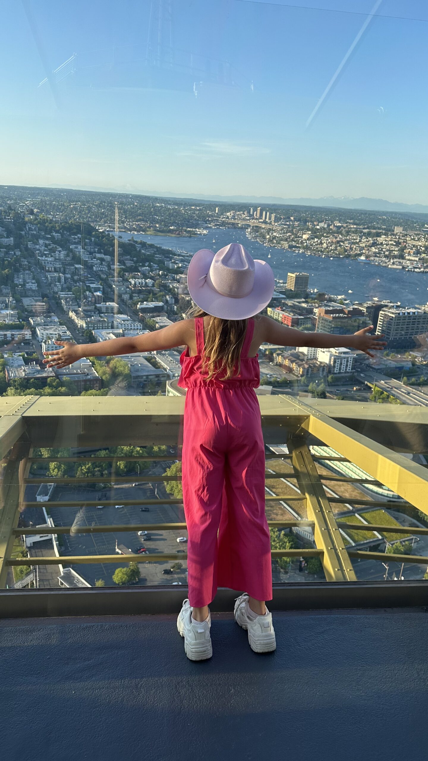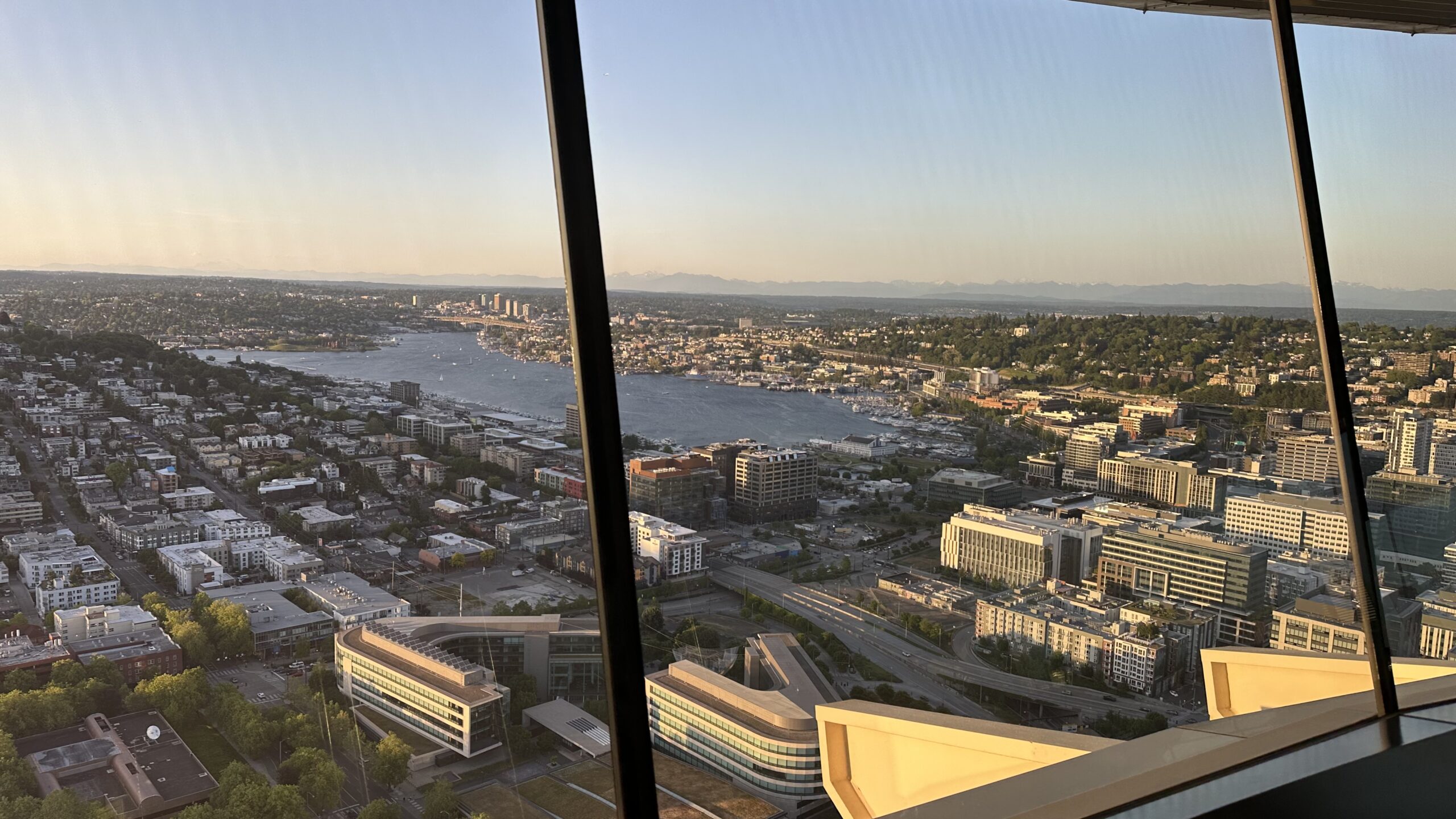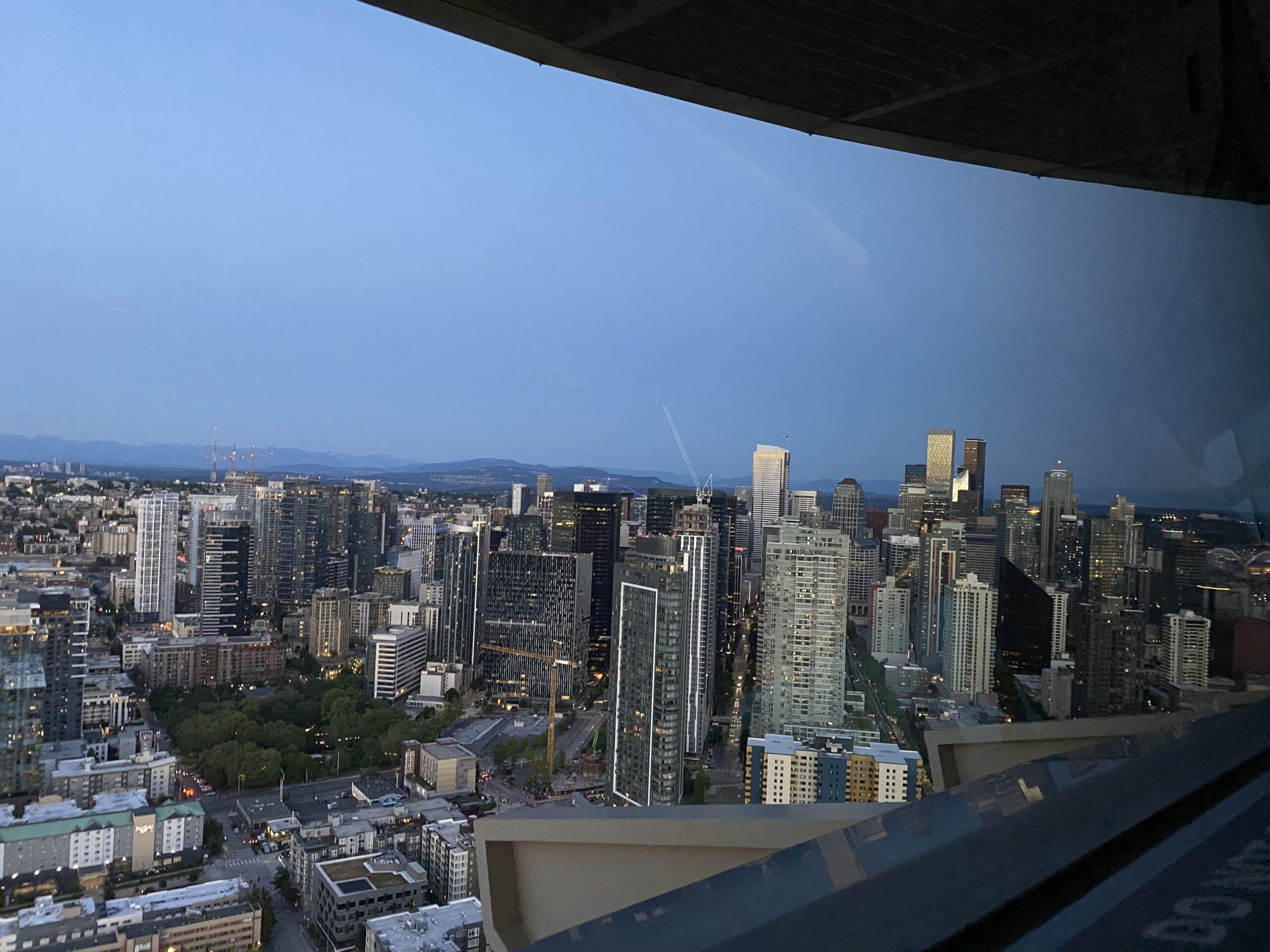 Na szczycie czeka otwarty taras widokowy. Taki, na którym czujesz wiatr, a barierki są ze szkła, więc nic nie zabiera widoku. Tu dopiero widać, jak bardzo Seattle jest „miastem pomiędzy” — między wodą a górami, między nowoczesnością a naturą.