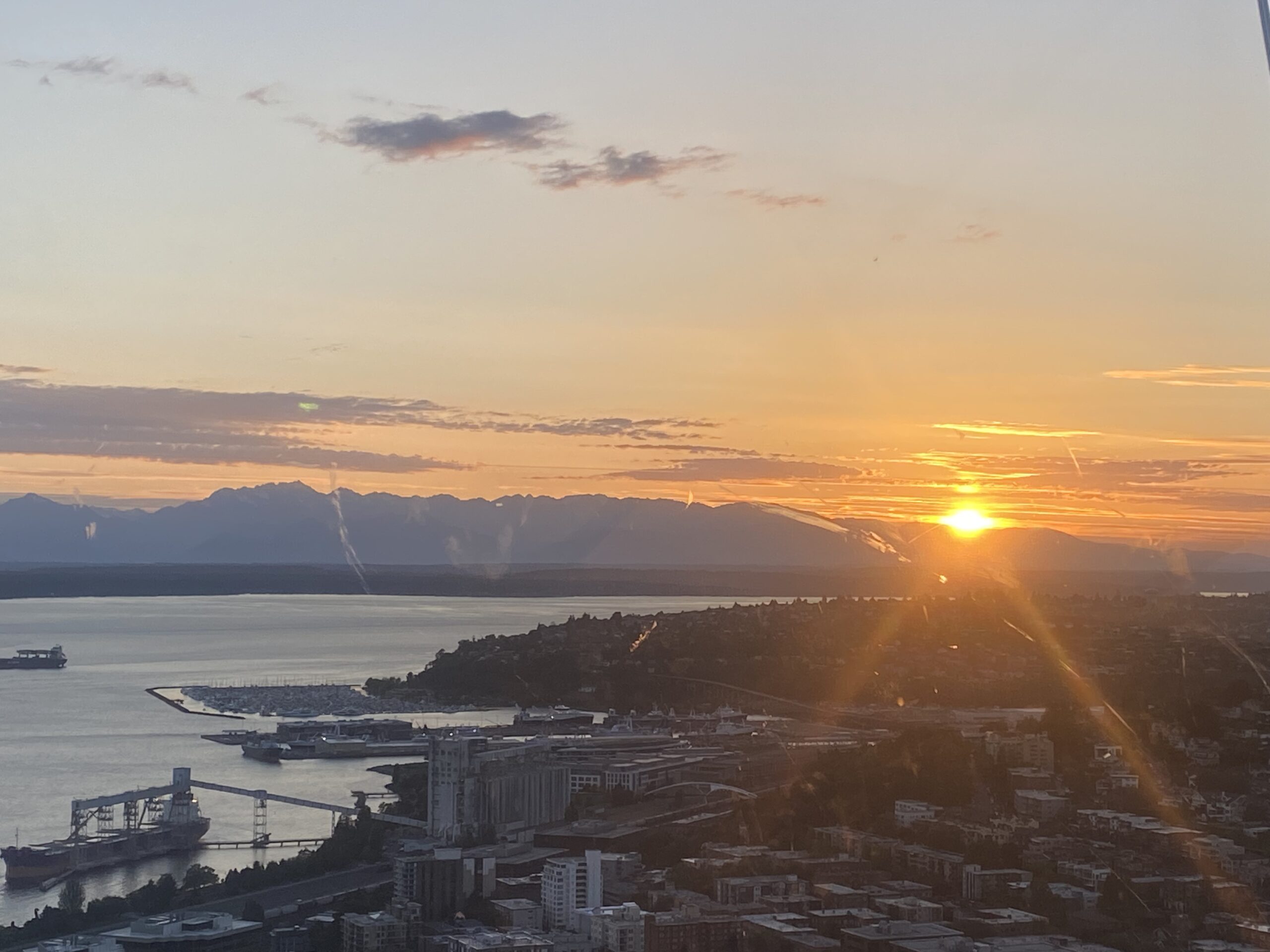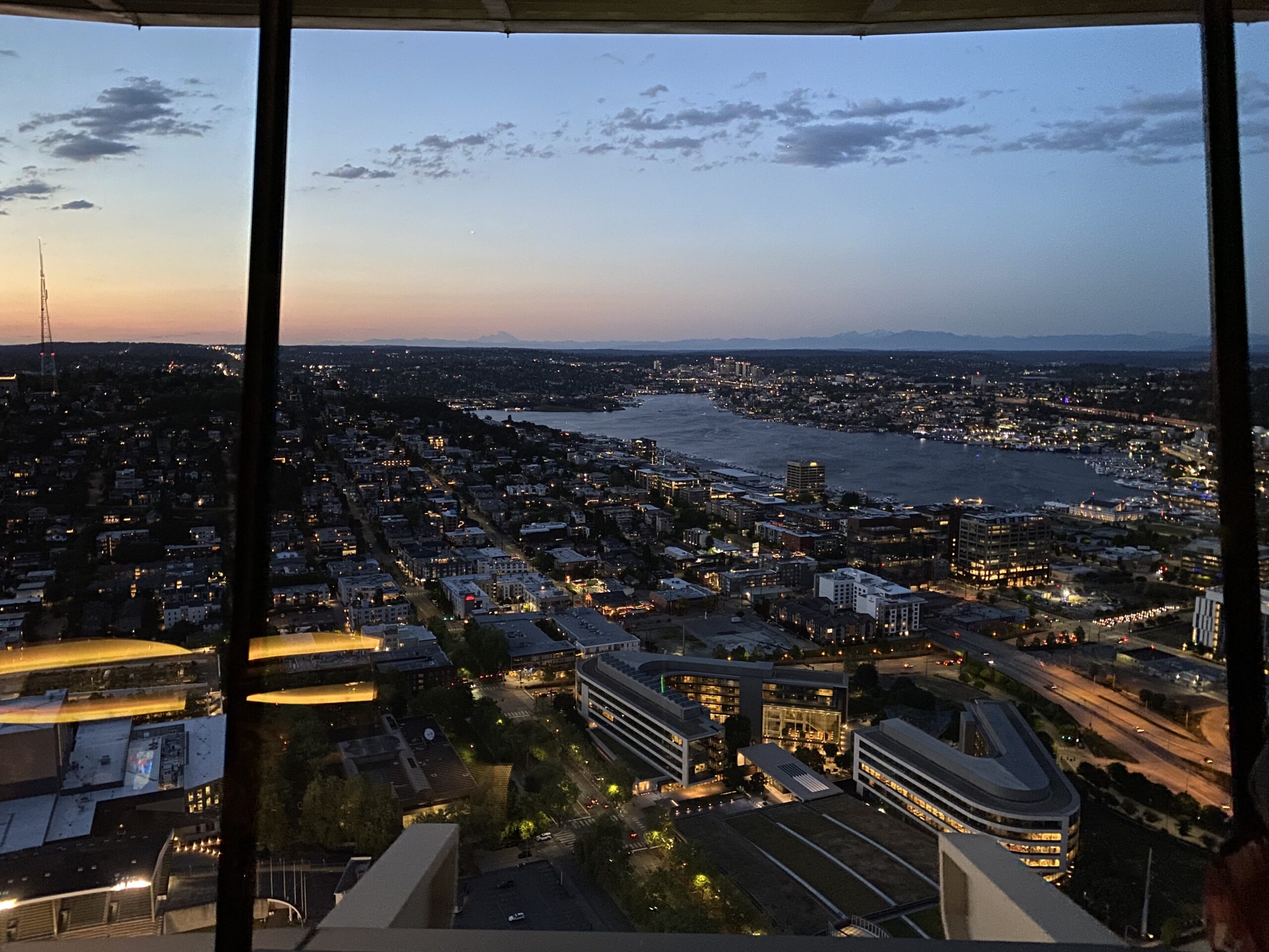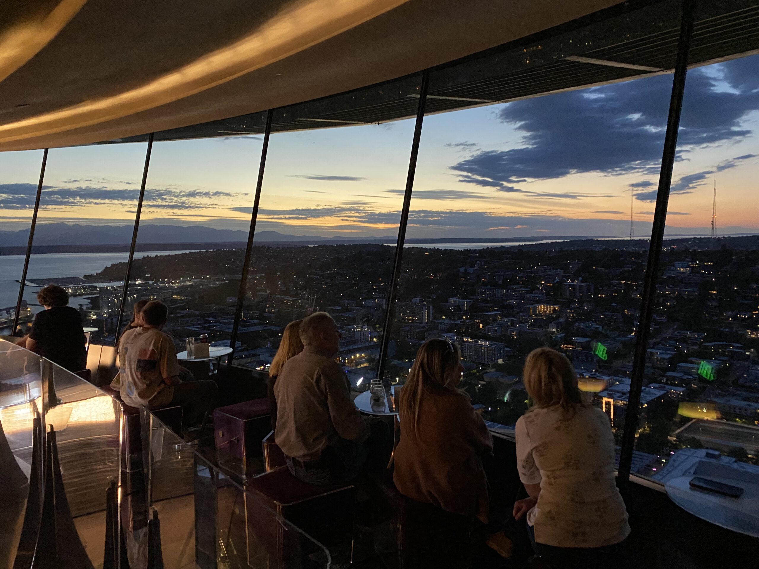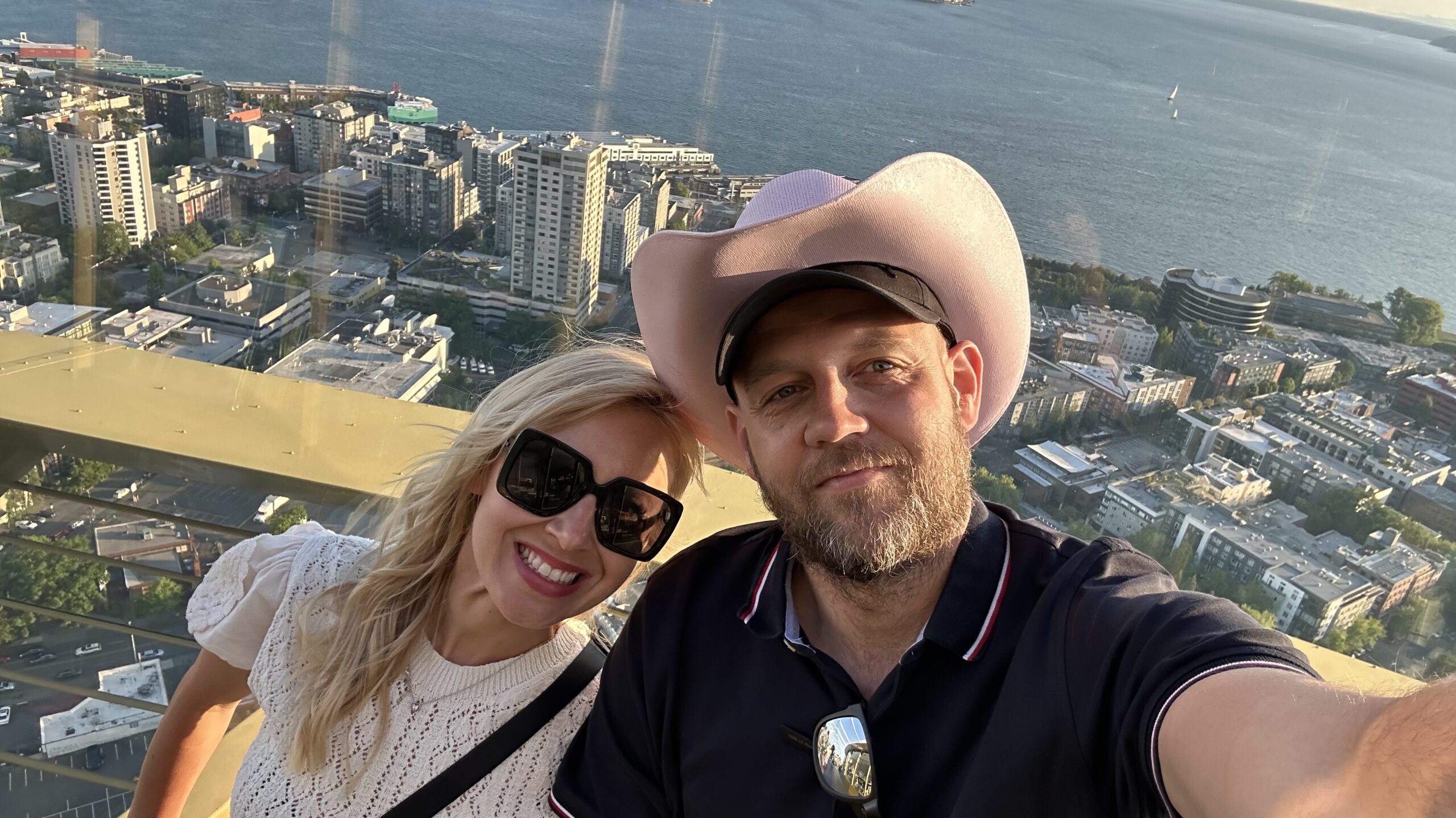 Złota godzina zamienia Space Needle. Miasto pod nami nabiera ciepłych barw, a Elliott Bay błyszczy jak roztopione złoto. To ten moment, kiedy człowiek mimowolnie wstrzymuje oddech, bo całość wygląda jak kadry z filmu.