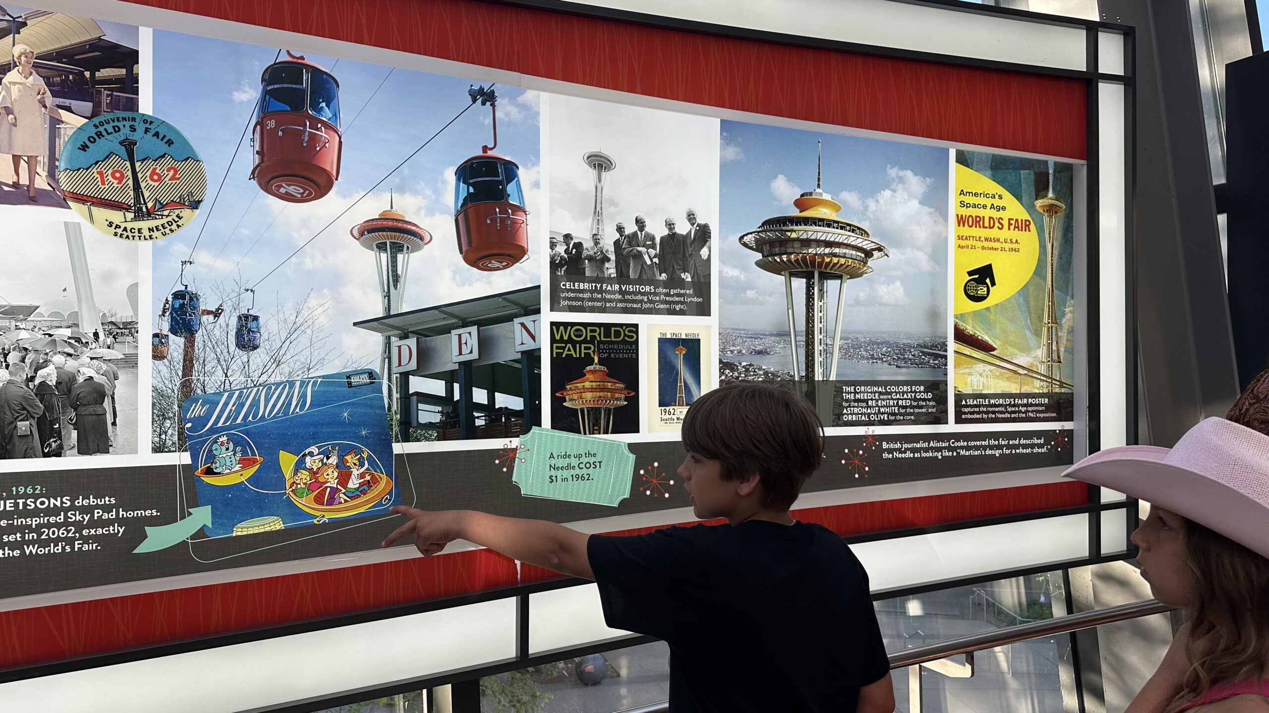 Na planszach poznaliśmy historię wieży, a przy okazji trafiliśmy na zabawną ciekawostkę. Twórcy Jetsonów inspirowali się space-age architekturą – m.in. Space Needle – projektując „podniebne” budynki Orbit City. Patrząc na projekt z lat 60., trudno się dziwić: ta konstrukcja wygląda jak żywcem wyjęta ze świata retrofuturyzmu.