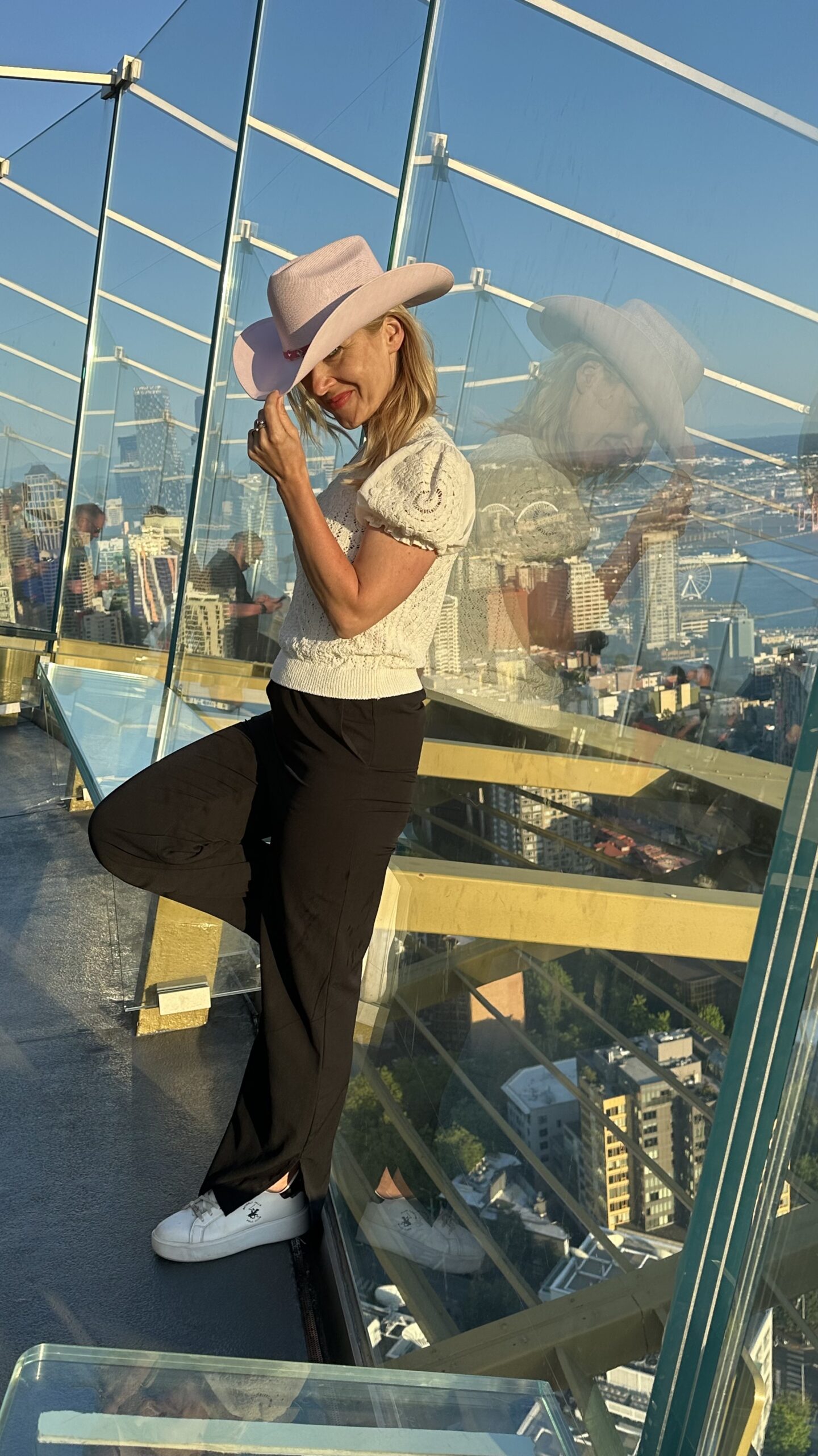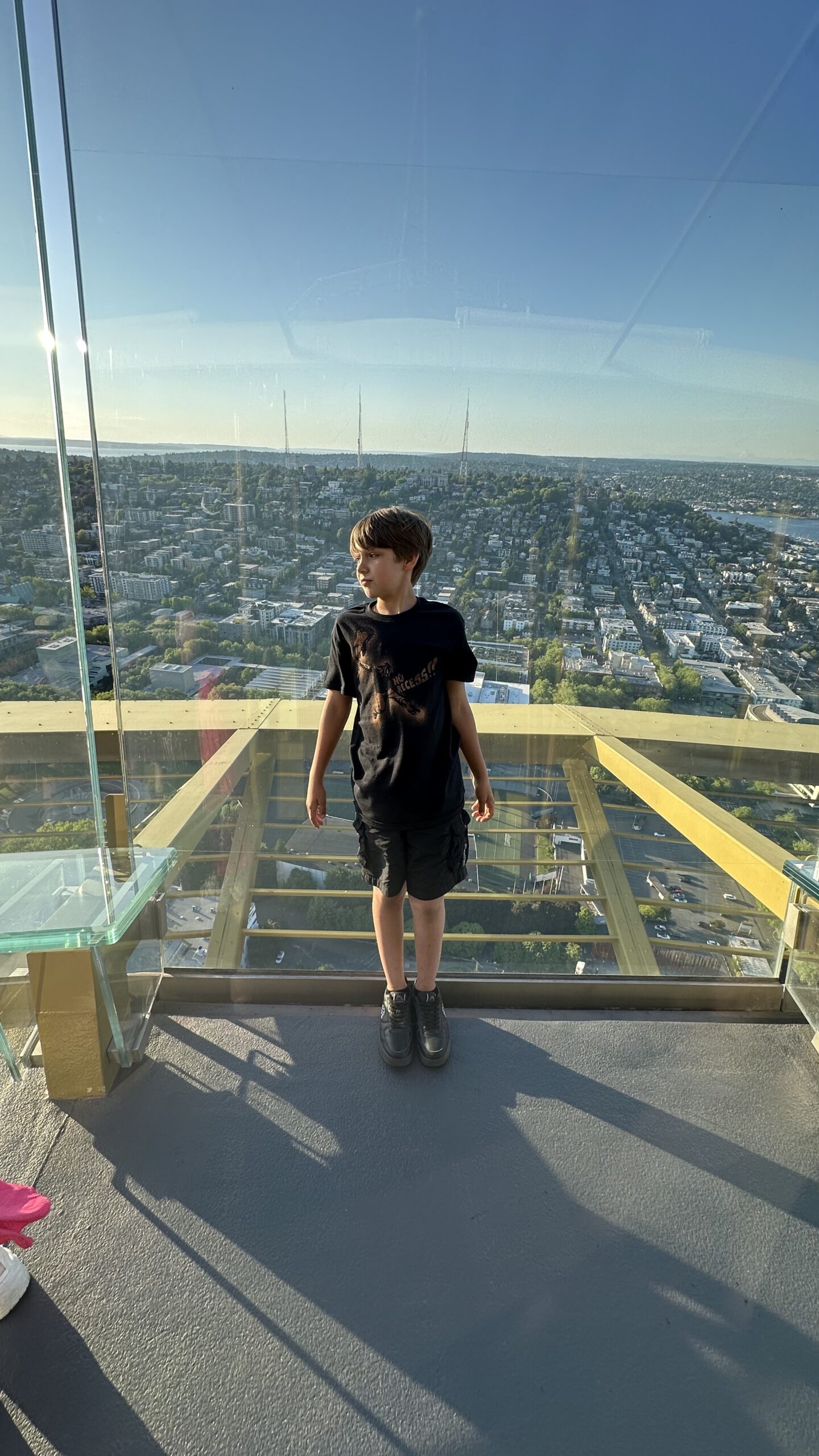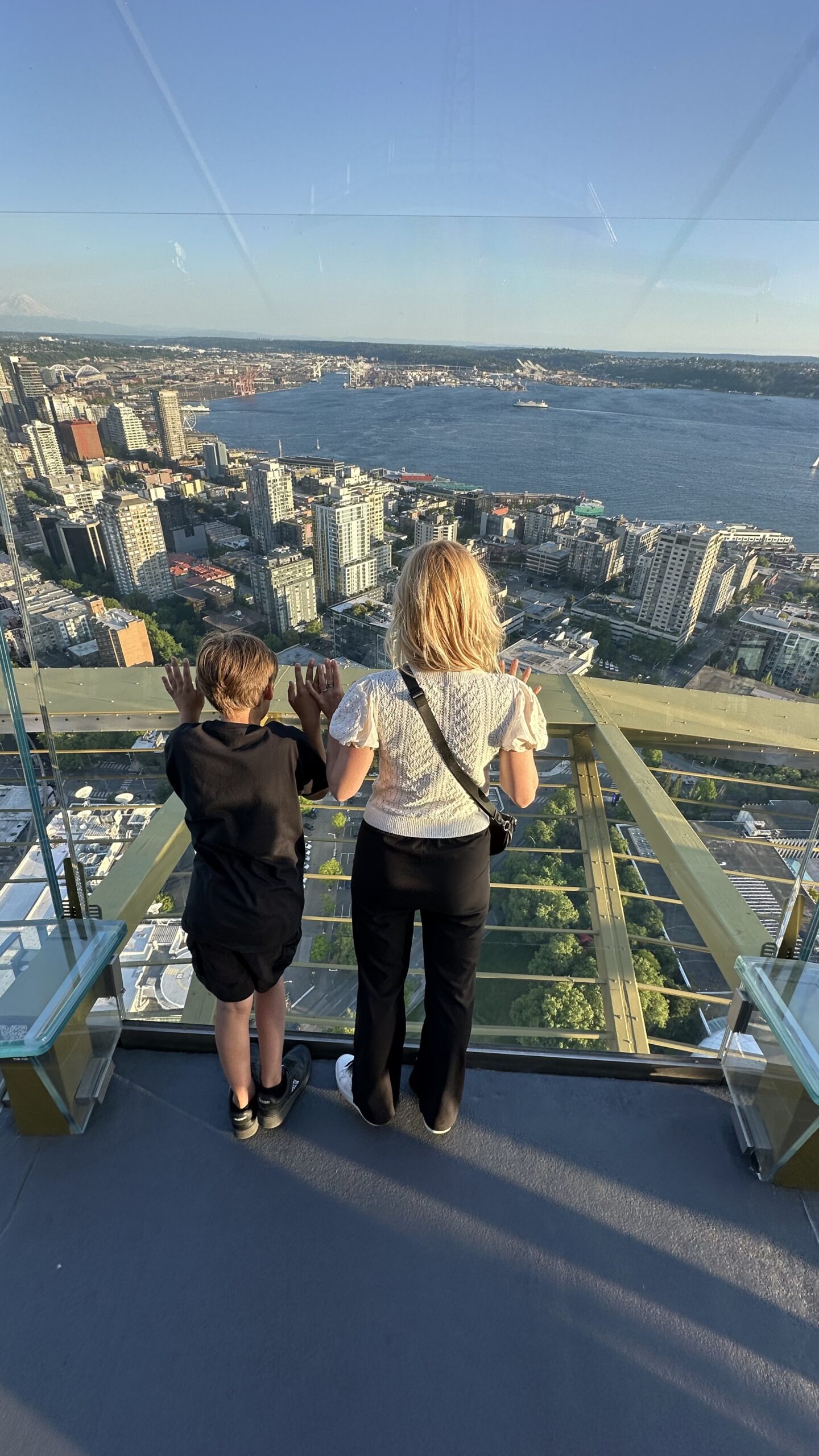 Klara i Jeremi, oczywiście, od razu położyli się na podłodze, żeby „sprawdzić widok na leżąco”. My potrzebowaliśmy jeszcze minuty, żeby się do tego przekonać, ale w końcu też to zrobiliśmy. Bo jak już jesteś na Space Needle, to po prostu to robisz.